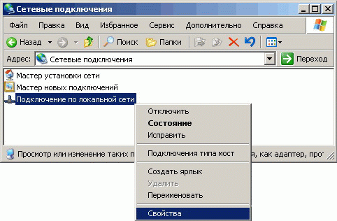 В открывшейся папке щелкните правой кнопкой мыши на пункте «Подключение по локальной сети» и в появившемся меню выберите команду «Свойства». |