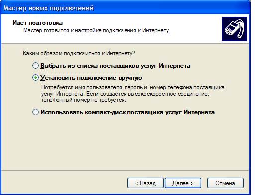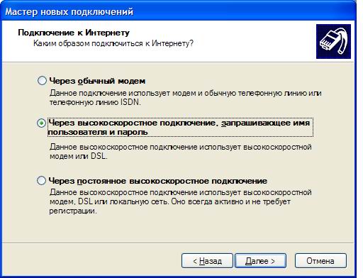 4. Чтобы создать высокоскоростное подключение, требующее регистрации, выберите вариант Через высокоскоростное подключение, запрашивающее имя пользователя и пароль и нажмите кнопку Далее. |