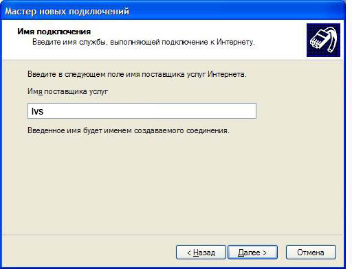 5. Введите "lvs" в поле Имя поставщика услуг и нажмите кнопку Далее. |