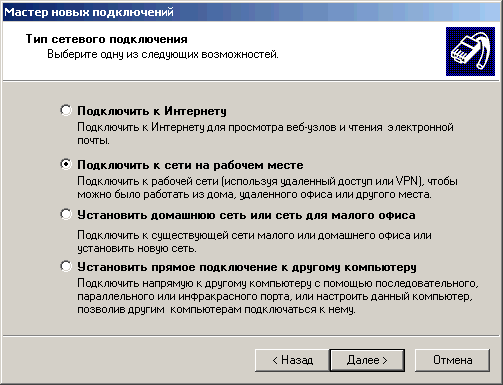 6. Выберите пункт «Подключить к сети на рабочем месте». Нажмите кнопку «Далее».