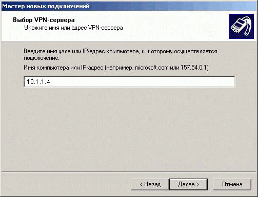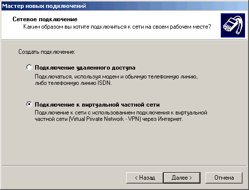 7. Выберите пункт «Подключение к виртуальной частной сети». Нажмите кнопку «Далее».